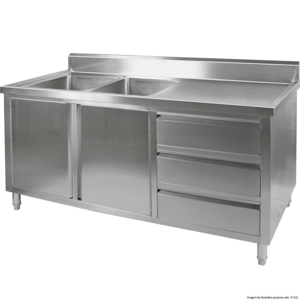 | | | Great for open kitchens Two Right Sinks 2400 mm wide ALL STAINLESS STEEL KITCHEN TIDY CABINET WITH SINK, DOORS & DRAWERS • 700 mm deep × 900 mm high + 150 mm splashback • “Punched” bowls • Bowl size 450mmW×450D×300H • 90 mm Ø drain hole • pre-assembled with all welded joins • Top & Frame: 1.2 mm; SUS304 grade (18/8); Hairline finish • Doors & drawers are 0.9 mm